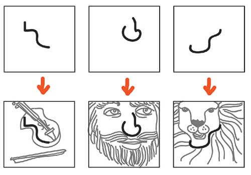 See the example below. Look at the squiggly lines on the first row. In 2 minutes, try to draw something interesting using those as a start.