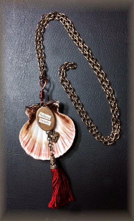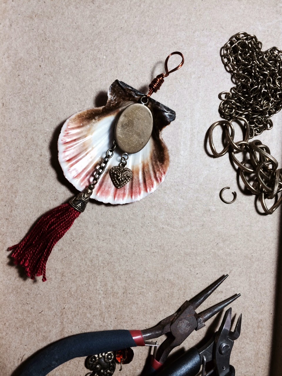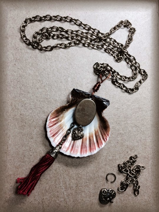 I had my dad drill a hole on the scallop shell. Then I looked through some old jewelry, took them apart,and created something new out of it. I used copper wire to attach the tassel hanging to the shell.