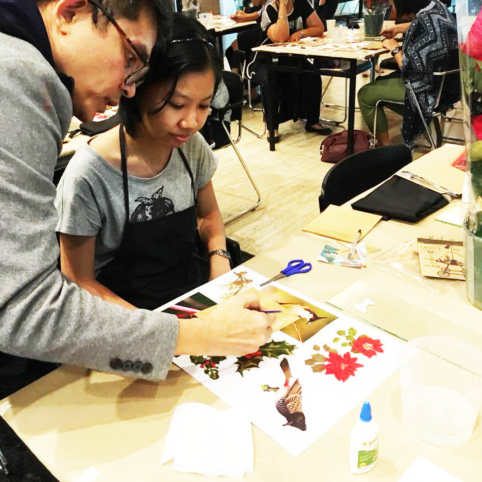 The afternoon session on learning basic acrylic painting skills were attended by "kid"-dults! They were able to recreate Robert's postcard design and discover tricks in developing their own designs for future projects.