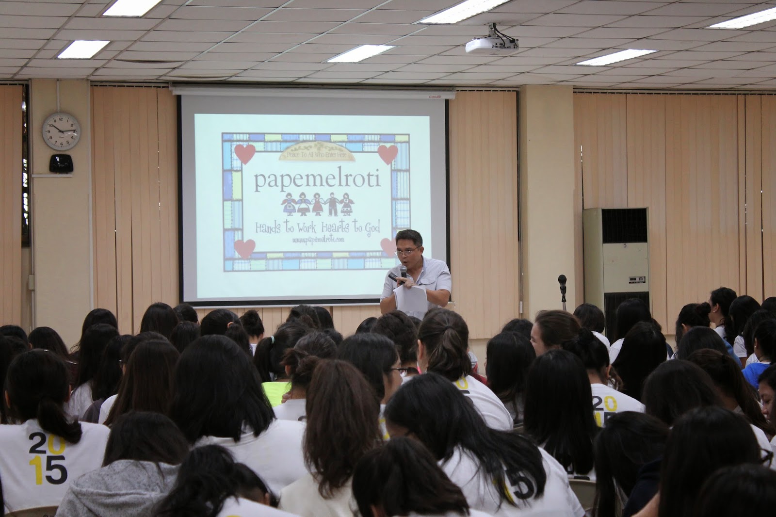 Papemelroti owner and resident artist Robert Alejandro shared about giving back at Assumption College's Year IV PEACE Work Project Launch last July 31, 2014.