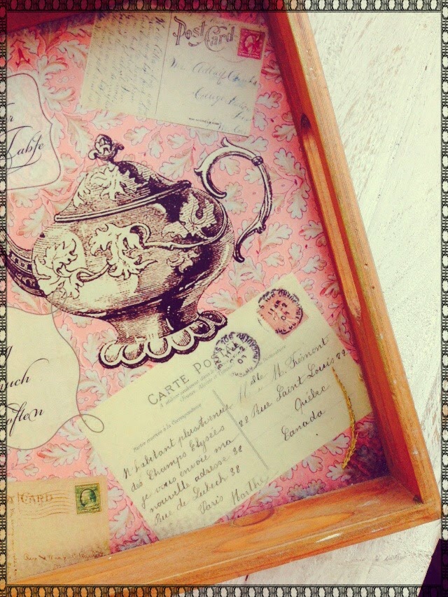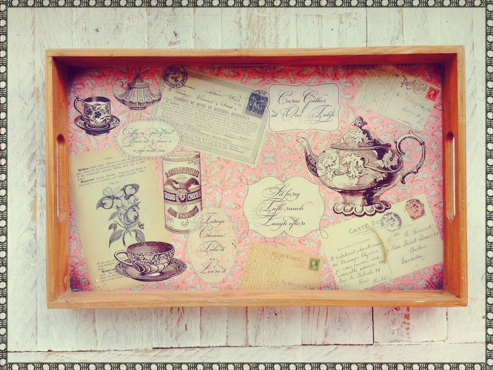 Quaint and rustic, this tray has vintage designs for that perfect tea party.  Has that charming French feel.  Serve your guests in shabby chic style.  You can also just use this as wall decor as it is pretty enough for that!  Made with recycled wood.  Handcrafted with care.  Size 14.5" x 8 7/8" x 1 3/8", 380g