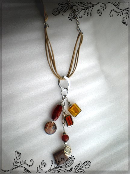This lariat type necklace has a mix of metal and clear beads made by Papemelroti designer Meldy.  A leather cord holds it all together.  Here's the full view...