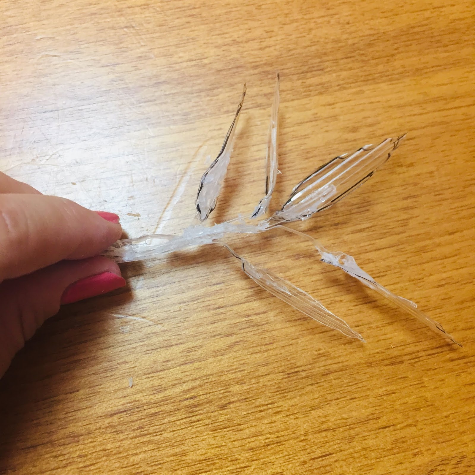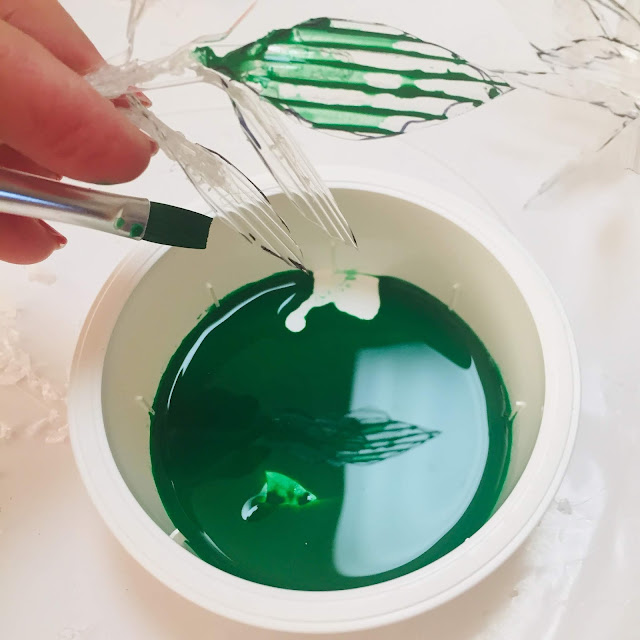 11. This is the part where the magic begins and the plastic starts to look like leaves! Sharing with you my boo boo. I thought the acrylic would adhere to plastic but the ridges were making the process take too long. So I recommend using spray paint instead. I did nail polish since it seemed the most common material to find.