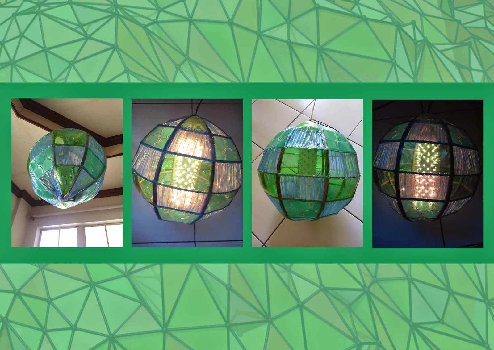 Leslie Anne says, "This lantern is basically made out of an old bilao, plastic bottles, plastic cups and plastic bags. The lantern is inspired by the earth, considering its shape and colors. My finished work is now hanging in our living room."