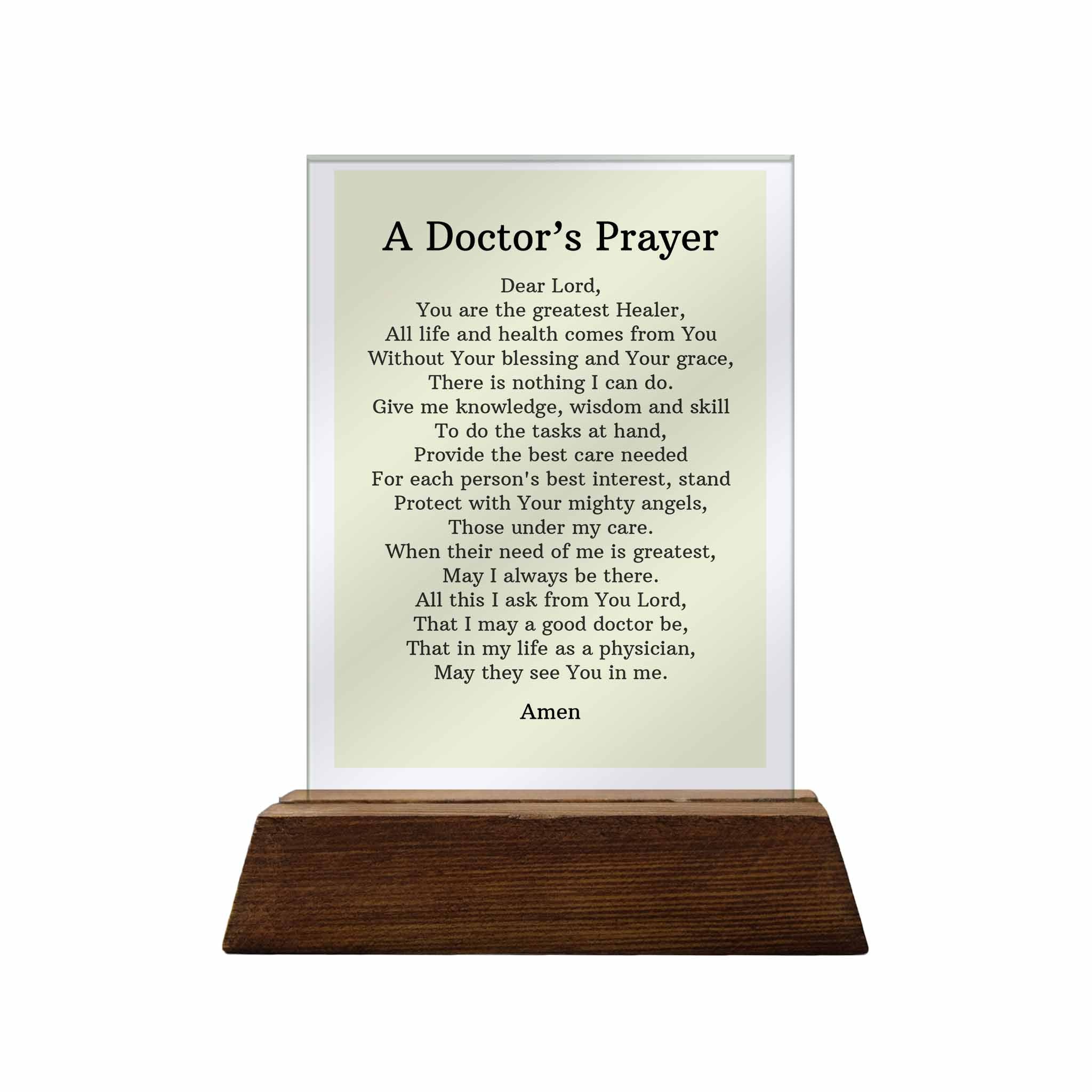 This papemelroti glass plaque features "A Doctor's Prayer." "Dear Lord, You are the greatest Healer, All life and health come from You Without Your blessing and your grace, There is nothing I can do."