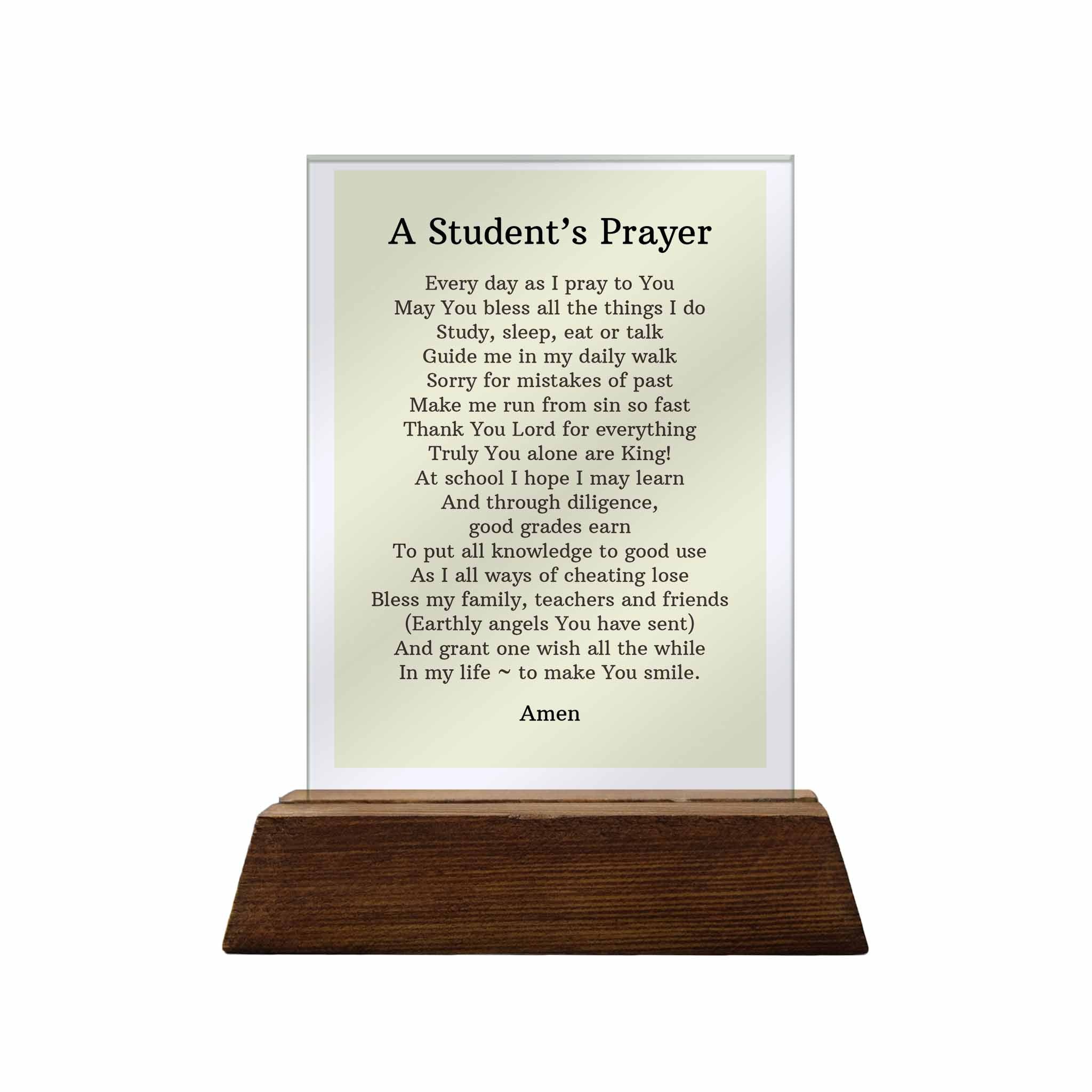 This papemelroti glass plaque features "A Student's Prayer." Every day as I pray to you May You bless all the things I do Study, sleep, eat or talk Guide me in my daily walk Sorry for mistakes of past Make me run from sin so fast Thank You Lord for everything Truly You alone are King! At school I hope I may learn And through diligence, good grades earn To put all knowledge to good use As I all ways of cheating lose Bless my family, teachers and friends.