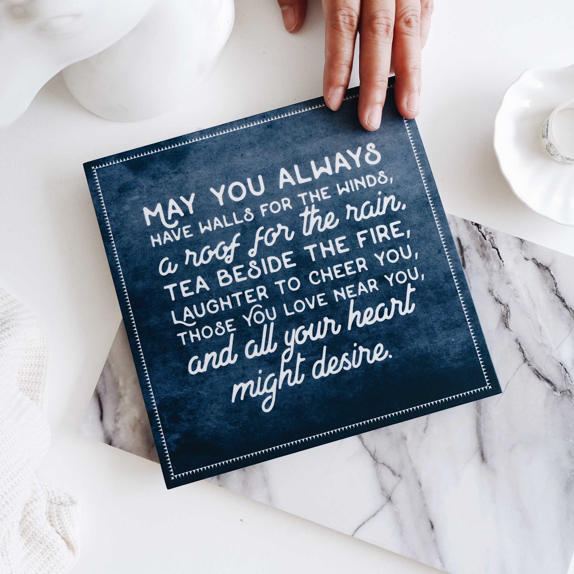 Hang something on your wall to inspire you! This original papemelroti decoposter features a heartfelt message, "May you always have walls for the winds, a roof for the rain, tea beside the fire, laughter to cheer you, those you love near you, and all your heart might desire."